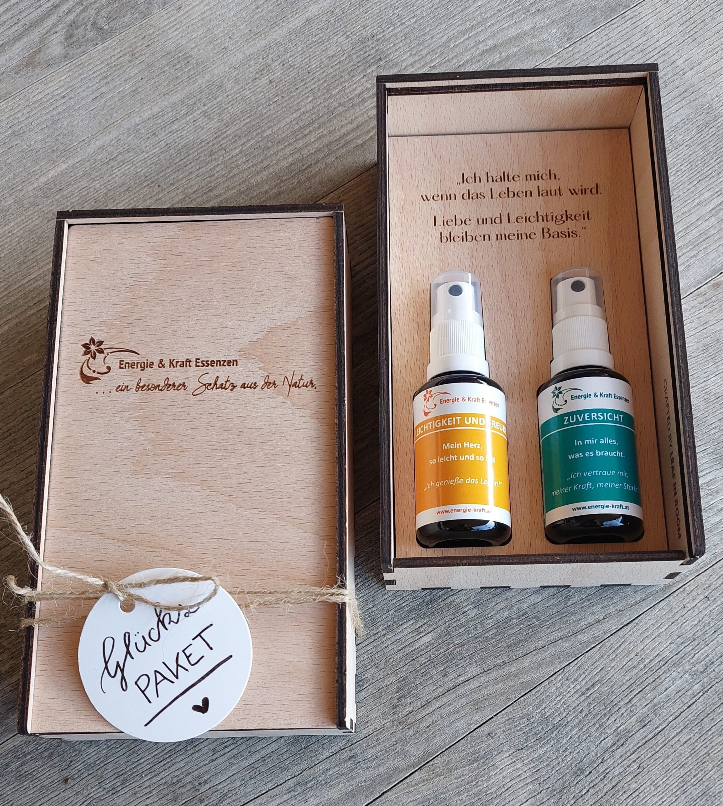 Zwei 30ml Sprays Zuversicht und Leichtigkeit und Freude wundervoll verpackt.
